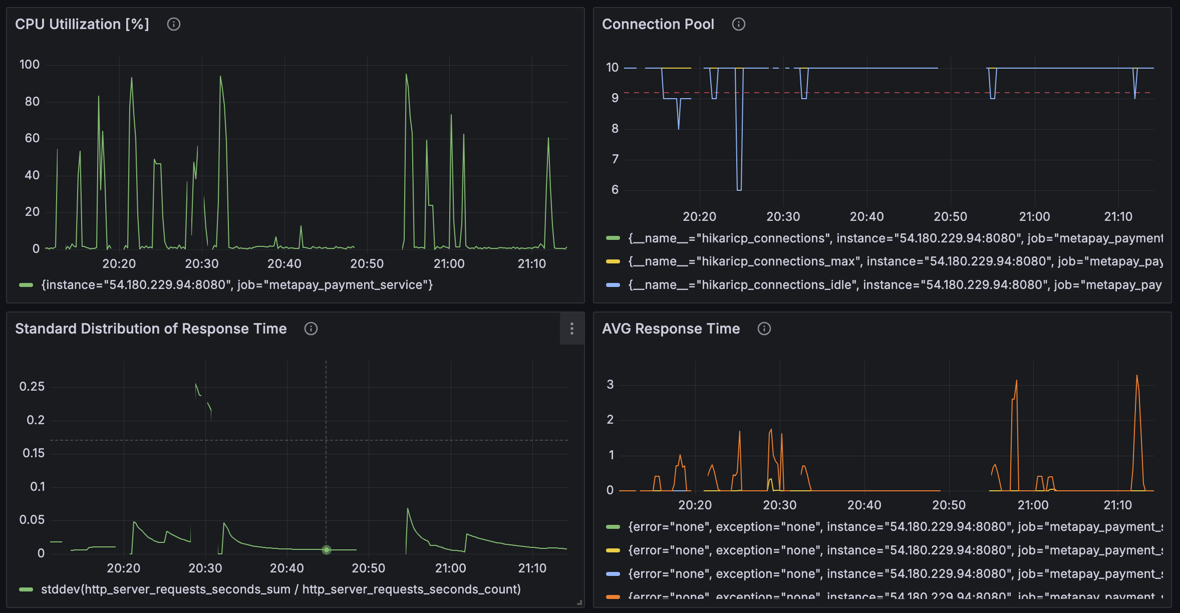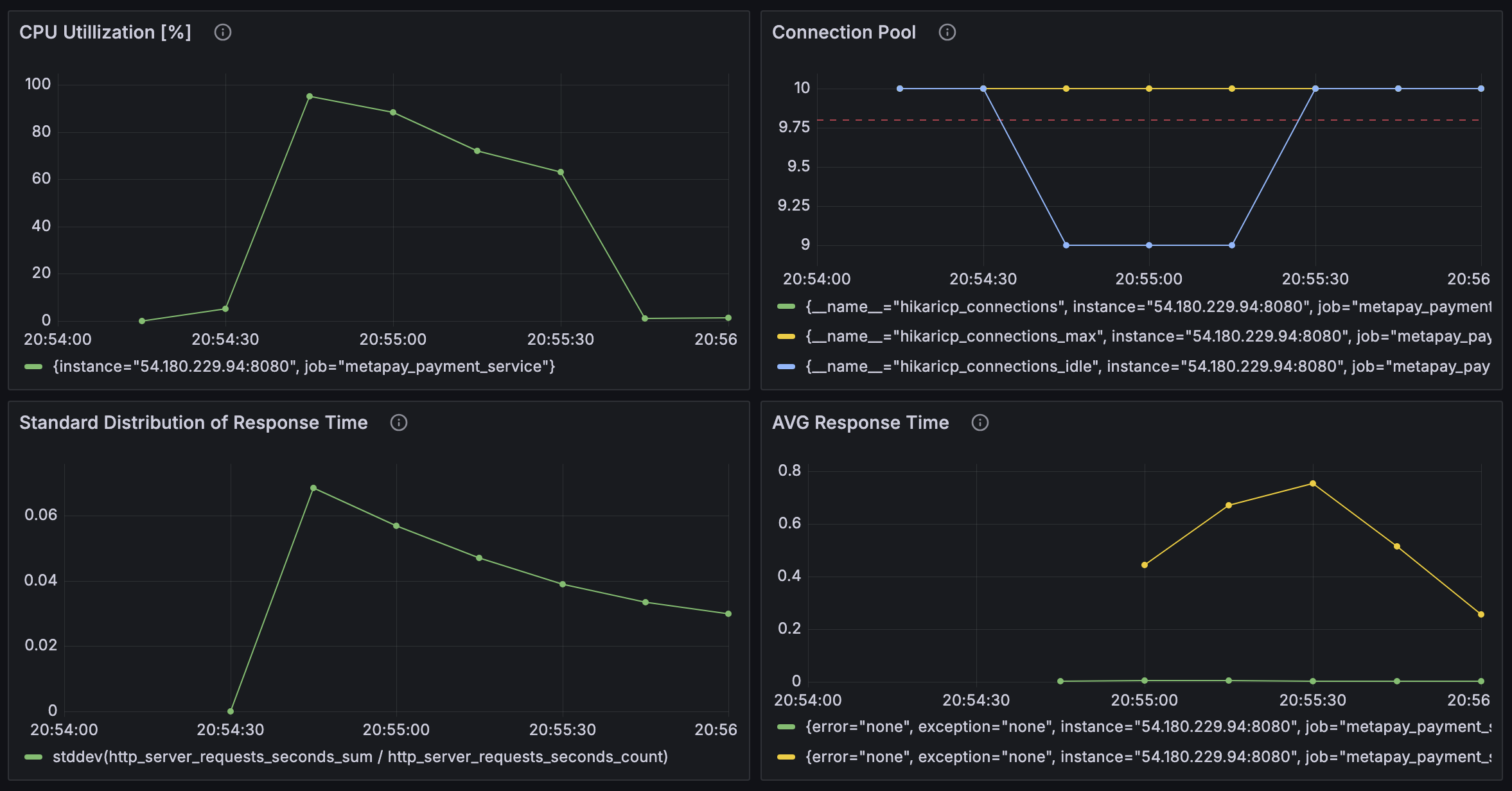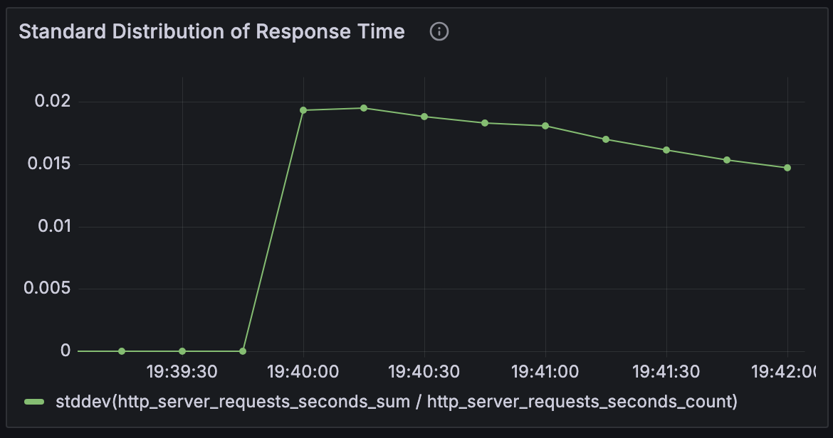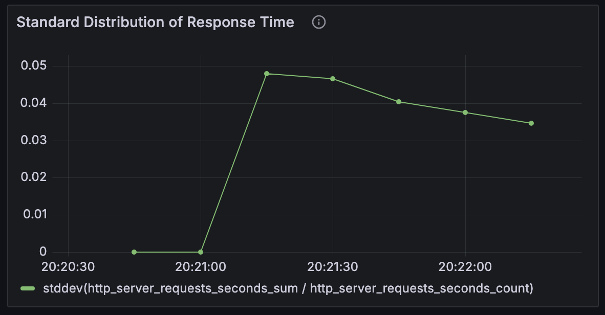 nGrinder 컨트롤러와 에이전트를 연결시키고, Prometheus와 Grafana를 이용해 메트릭을 수집하고 시각화하는 것까지 잘 되었다. 그런데 이상하게 어떤 조건에서도 CPU 점유율 양상이나, 평균 반응 시간 등의 그래프가 비슷한 양상을 띄었다. 분명히 조건이 달라진다면 반응도 달라져야 하는데, 언제나 똑같았다.