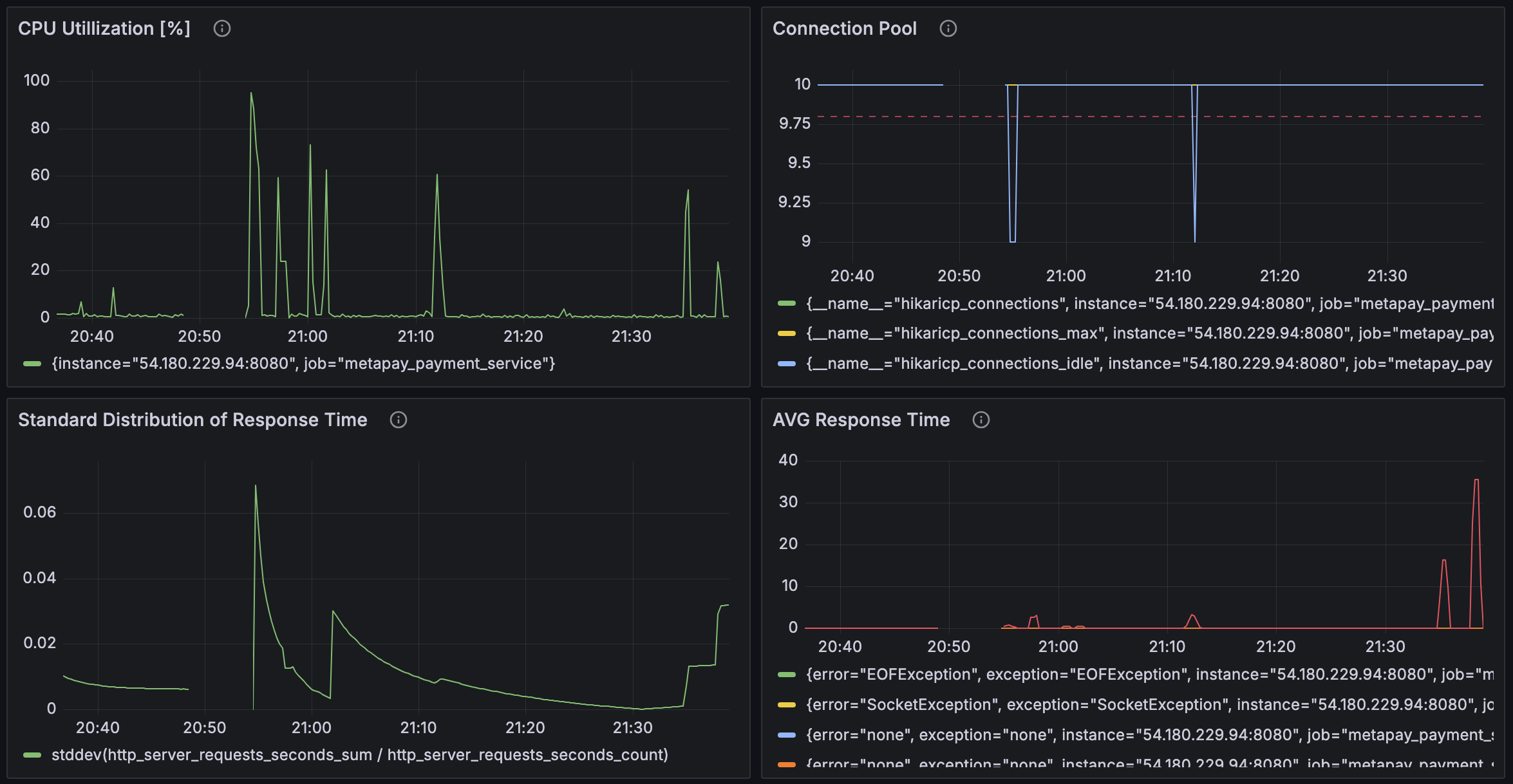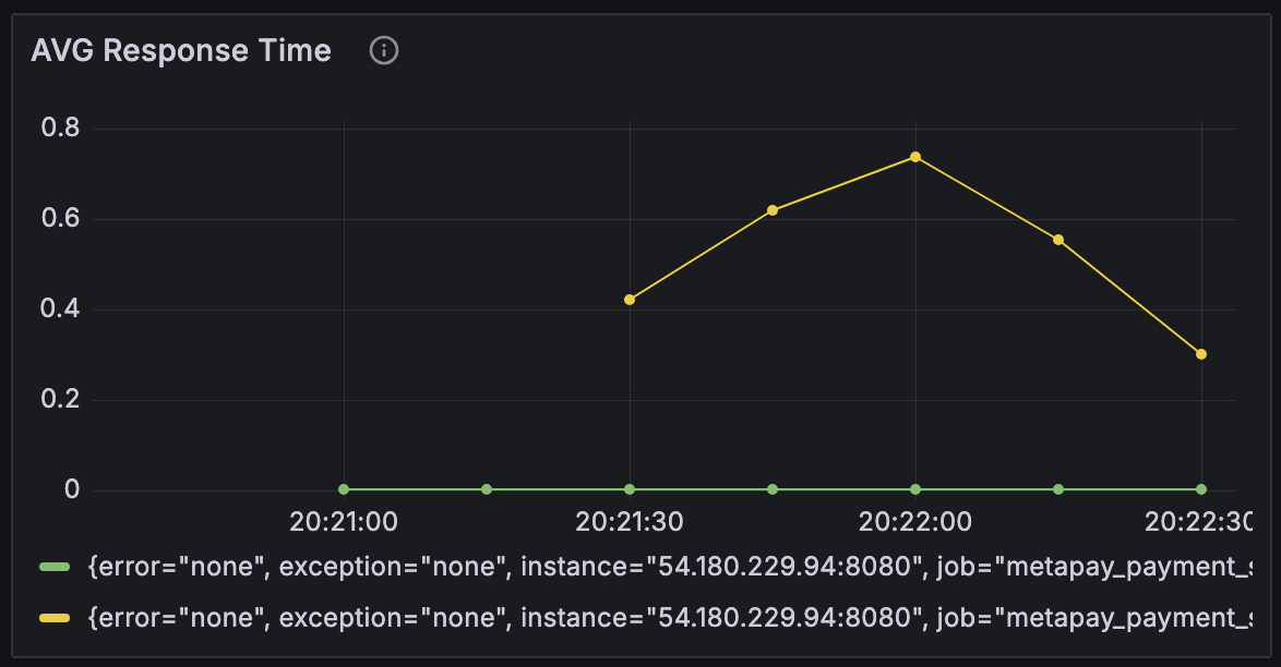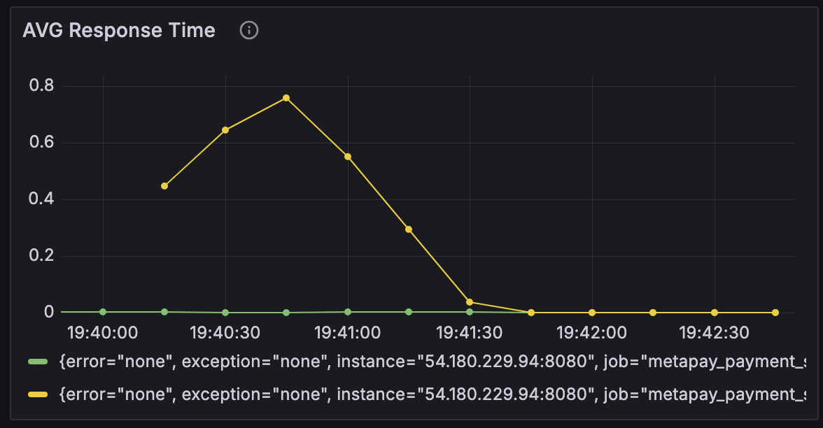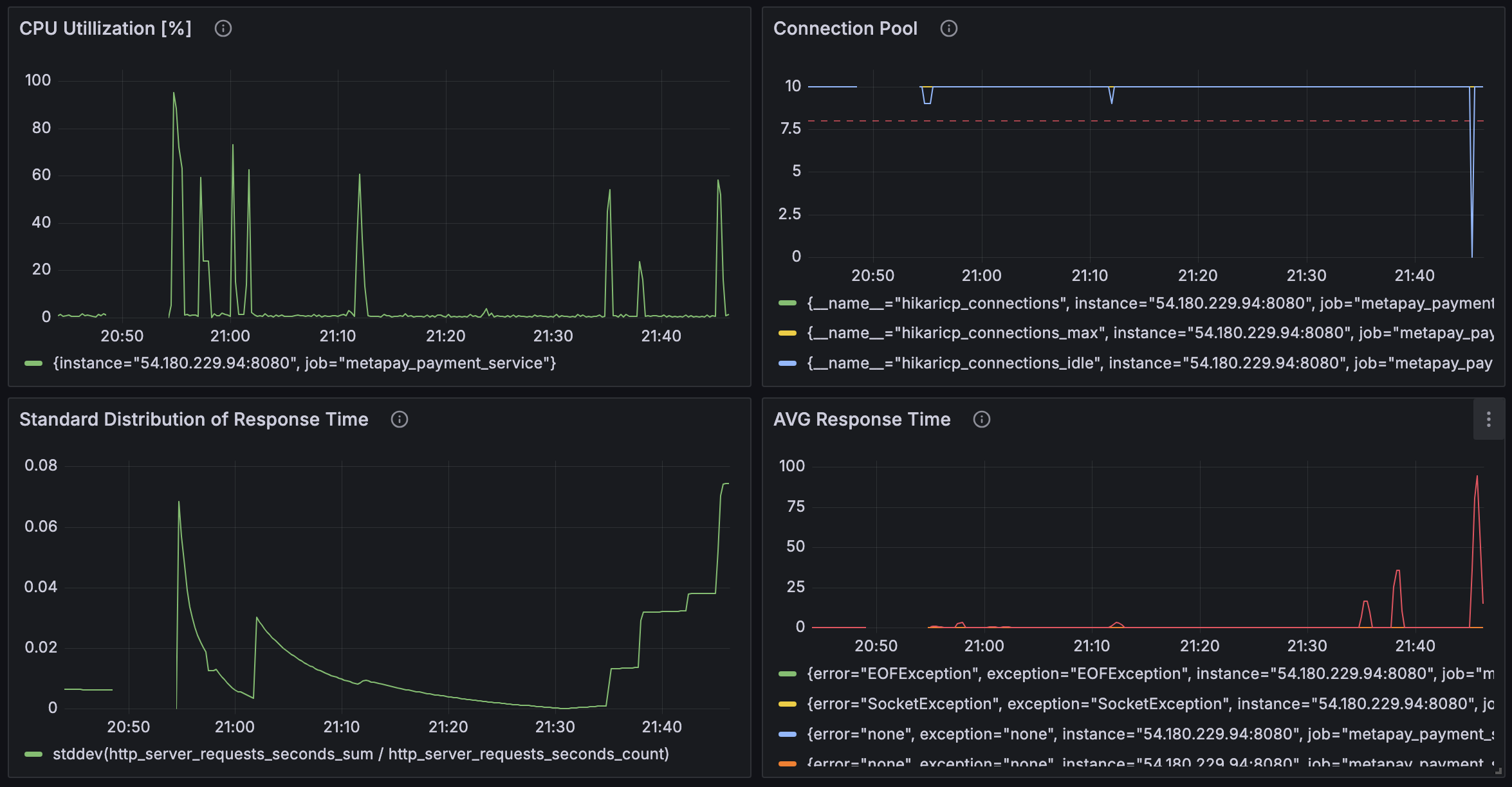 nGrinder 컨트롤러와 에이전트를 연결시키고, Prometheus와 Grafana를 이용해 메트릭을 수집하고 시각화하는 것까지 잘 되었다. 그런데 이상하게 어떤 조건에서도 CPU 점유율 양상이나, 평균 반응 시간 등의 그래프가 비슷한 양상을 띄었다. 분명히 조건이 달라진다면 반응도 달라져야 하는데, 언제나 똑같았다.