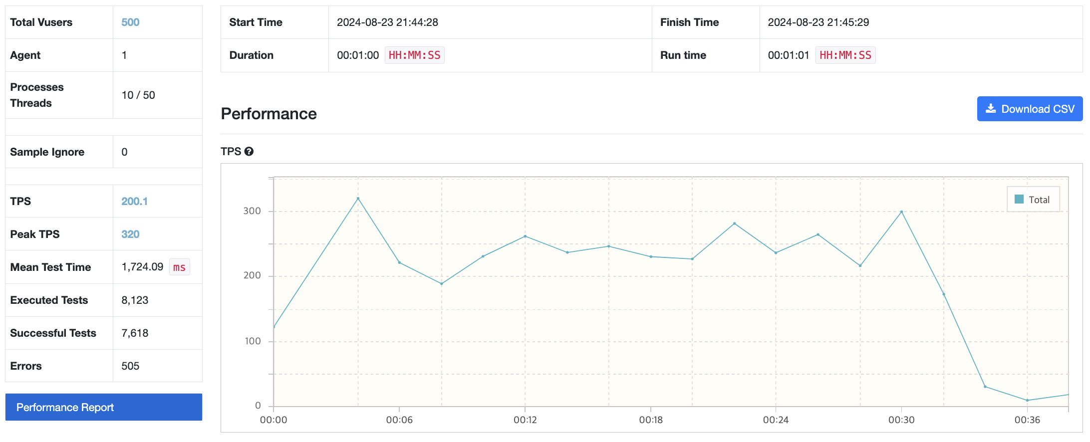Vuser 1000명도 시도해봤는데, 1000명은 테스트를 완수할 수 없었다.