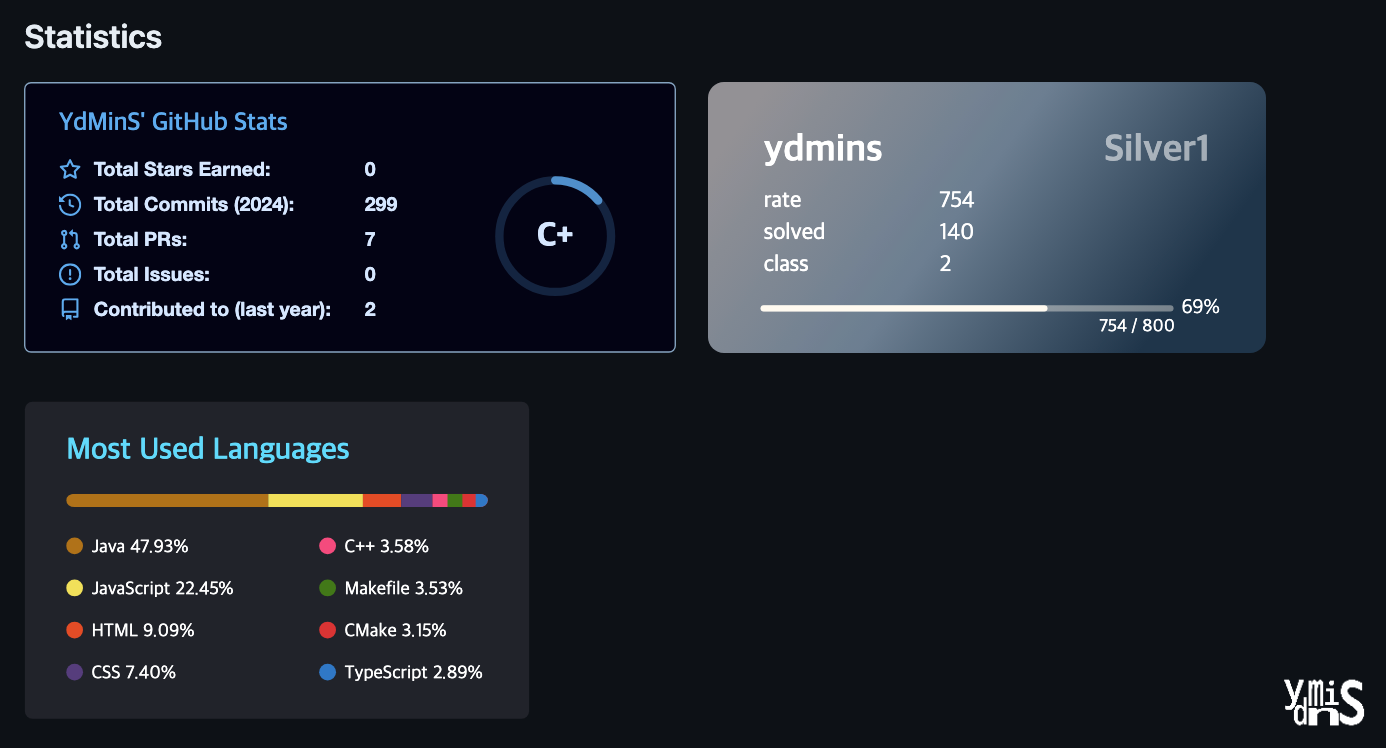이와 같은 통계를 적용할 땐 url에 쿼리 값에 자신의 아이디를 적절하게 넣어줘야 한다는 것이다. 첫번째(YdMinS' GitHub Stats)와 마지막(Most Used Languages)의 username에는 깃허브 계정을 넣어줘야 한다. 두번째 백준 등급조회를 위해선 boj 쿼리에 자신의 백준 계정을 넣어줘야 한다.